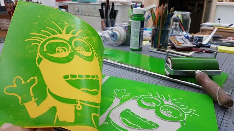 Gedruckt wird mit Alltagsgegenständen und allem was plan genug ist, um einen Abddruck zu erzeugen. Diese einfache Technik macht Spaß und führt schnell zu verblüffenden Ergebnissen.