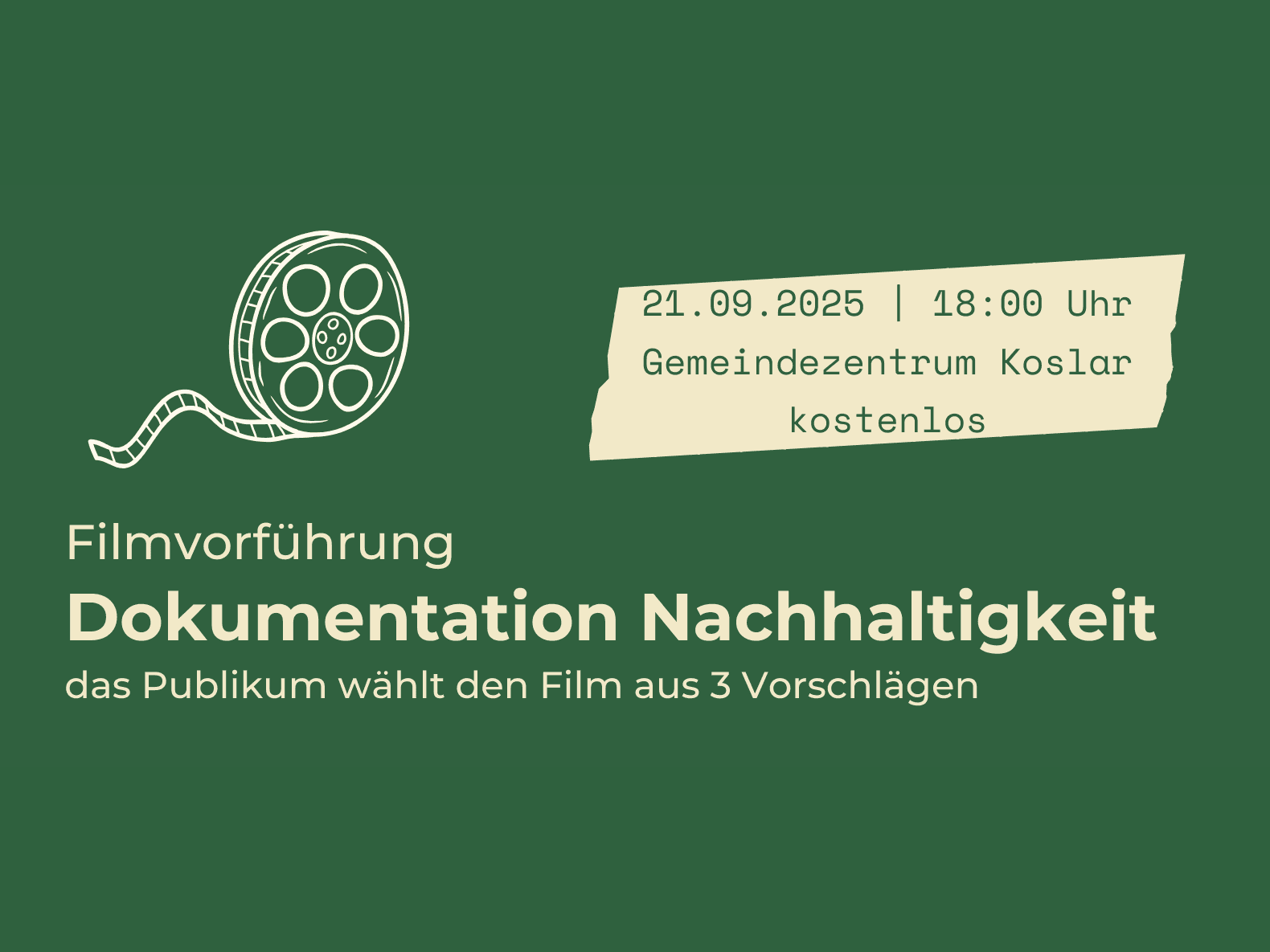 Die Filmvorführung der Katholischen Öffentlichen Bücherei Heilig Geist (KÖB) im Gemeindesaal Koslar steht unter dem Fokus „Nachhaltigkeit“. Es stehen drei aktuelle Dokumentationen in Spielfilmlänge zur Auswahl. Klimafreundliche Projekte, Ideen für eine umweltschonende Zukunft, oder Aktionen gegen die Konsumgesellschaft – die Zuschauer entscheiden am Abend der Vorstellung, welchen der drei, zum Teil prämierten, Filme gezeigt wird. Alle an diesem wichtigen Thema interessierten Menschen sind herzlich eingeladen.